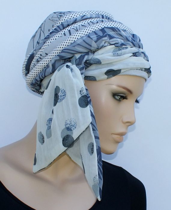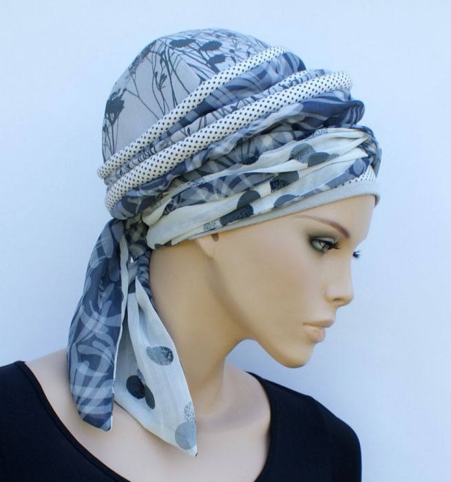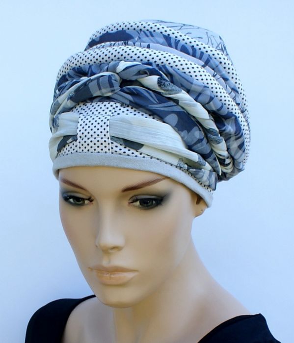 Lekki turban uszyty z cieniutkich materiałów, na delikatnej podszewce z batystu. Połączenie różnych gatunków tkanin. Doskonałe nakrycie głowy na dzień i wieczór, plażę w kurorcie, centrum wielkiego miasta lub do ogródka... WYJŚCIE AWARYJNE jeśli zabrakło wody w kranie albo nie zdążyłaś zadbać o fryzurę. Ucieczka od peruki dla kobiet po chemioterapii. Lekki, przewiewny, w uniwersalnym rozmiarze, z możliwością różnych wariantów zamotania mobilnej szarfy (można nosić jak czapkę, bez szarfy przewleczonej przez szlufkę z tyłu). Specjalna konstrukcja pozwala zachować właściwą formę po praniu.