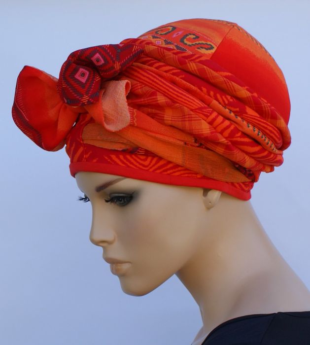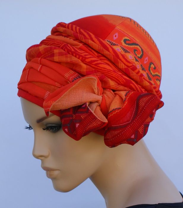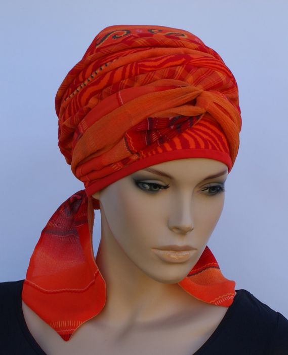 Lekki turban uszyty z cieniutkich materiałów, na delikatnej podszewce z batystu. Połączenie różnych gatunków tkanin. Doskonałe nakrycie głowy na dzień i wieczór, plażę w kurorcie, centrum wielkiego miasta lub do ogródka... WYJŚCIE AWARYJNE jeśli zabrakło wody w kranie albo nie zdążyłaś zadbać o fryzurę. Ucieczka od peruki dla kobiet po chemioterapii. Lekki, przewiewny, w uniwersalnym rozmiarze, z możliwością różnych wariantów zamotania mobilnej szarfy (można nosić jak czapkę, bez szarfy przewleczonej przez szlufkę z tyłu). Specjalna konstrukcja pozwala zachować właściwą formę po praniu.