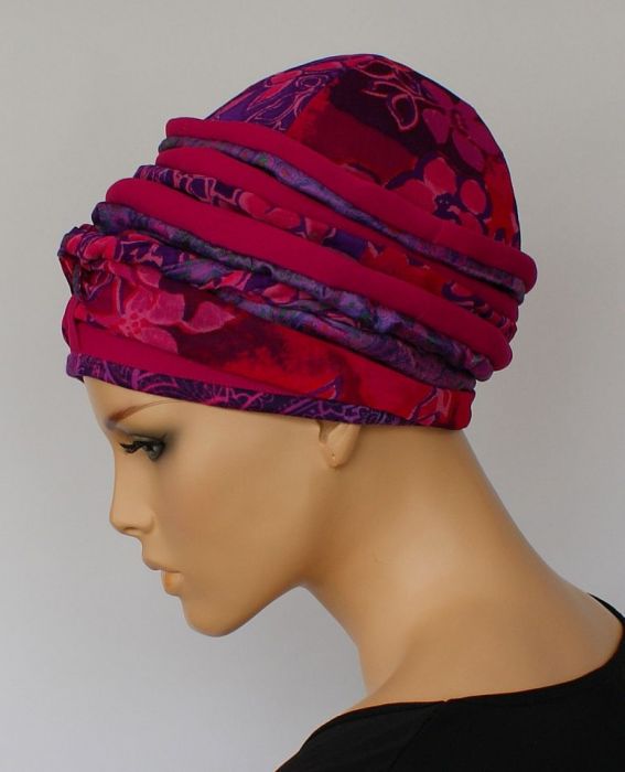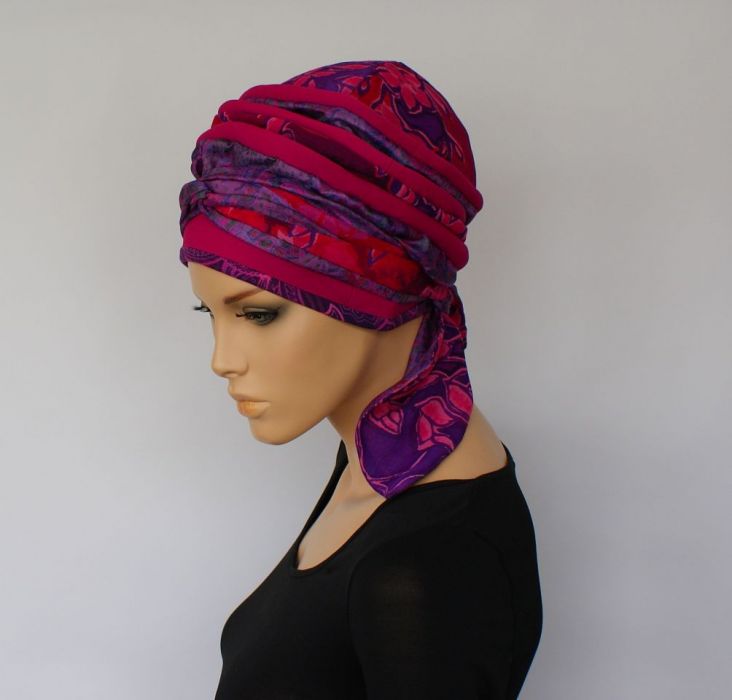 Lekki turban uszyty z cieniutkich materiałów, na delikatnej podszewce z batystu. Połączenie różnych gatunków tkanin. Doskonałe nakrycie głowy na dzień i wieczór, plażę w kurorcie, centrum wielkiego miasta lub do ogródka... WYJŚCIE AWARYJNE jeśli zabrakło wody w kranie albo nie zdążyłaś zadbać o fryzurę. Ucieczka od peruki dla kobiet po chemioterapii. Lekki, przewiewny, w uniwersalnym rozmiarze, z możliwością różnych wariantów zamotania mobilnej szarfy (można nosić jak czapkę, bez szarfy przewleczonej przez szlufkę z tyłu). Specjalna konstrukcja pozwala zachować właściwą formę po praniu.