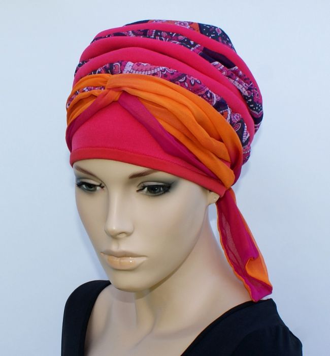 Lekki turban uszyty z cieniutkich materiałów, na delikatnej podszewce z batystu. Połączenie różnych gatunków tkanin. Doskonałe nakrycie głowy na dzień i wieczór, plażę w kurorcie, centrum wielkiego miasta lub do ogródka... WYJŚCIE AWARYJNE jeśli zabrakło wody w kranie albo nie zdążyłaś zadbać o fryzurę. Ucieczka od peruki dla kobiet po chemioterapii. Lekki, przewiewny, w uniwersalnym rozmiarze, z możliwością różnych wariantów zamotania mobilnej szarfy (można nosić jak czapkę, bez szarfy przewleczonej przez szlufkę z tyłu). Specjalna konstrukcja pozwala zachować właściwą formę po praniu.