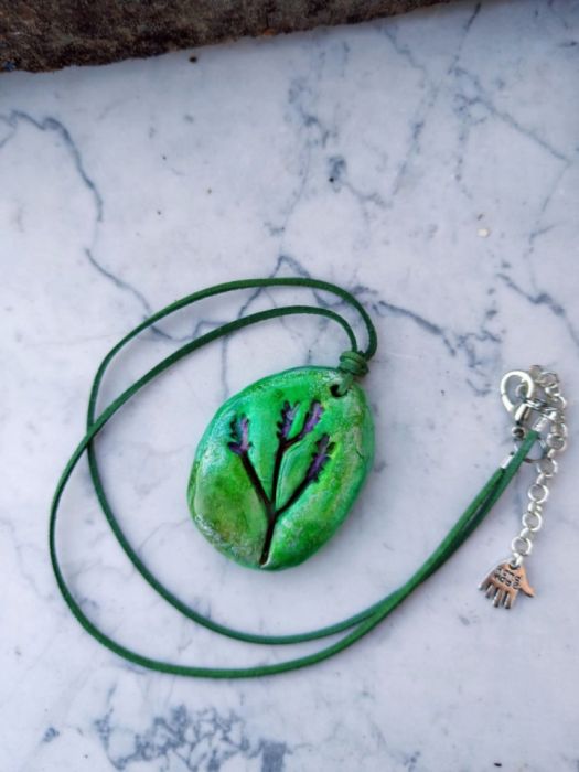 Leśna Harmonia to wyjątkowy, ręcznie malowany i wykonany wisiorek z glinki samoutwardzalnej, inspirowany naturą i subtelnym pięknem roślinnych motywów. Zielona, nieregularna forma przypominająca kamień została ozdobiona delikatnym reliefem gałązki z fioletowymi akcentami, co nadaje całości artystycznego i niepowtarzalnego charakteru.
