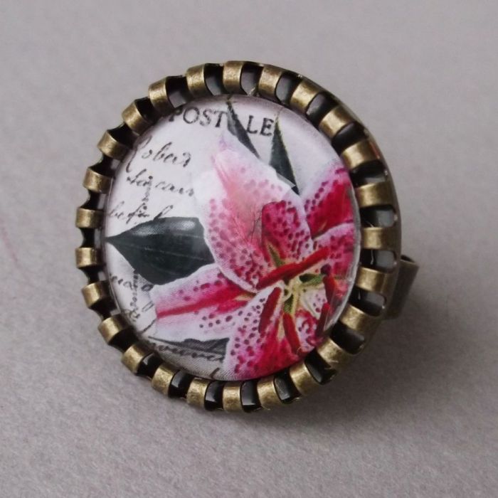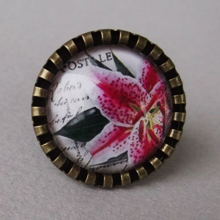 Duży, wygodny i pełen uroku pierścień z przepiękną grafiką umieszczoną pod taflą szkła. Całość oprawy w kolorze starego złota.