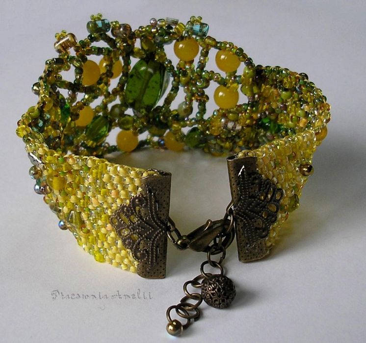 Bransoletka wypleciona ściegiem peyote ze szklanych koralików chińskich, czeskich, japońskich i indyjskich. Różnorodność kształtów i wielkości koralików oraz świeża kolorystyka sprawiają, że bransoleta prezentuje się naprawdę pięknie. Dodatkową ozdobą są metalowe końcówki w kolorze starego złota, do których dokleiłam metalowe dekory co dodało całości nieco antycznego wyglądu.