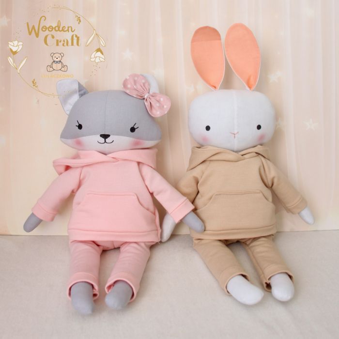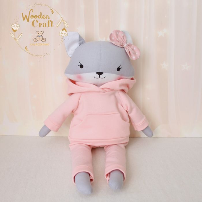 Przeurocza przytulanka, lisek a właściwie lisiczka w odcieniach szarości i bieli, uszyta ręcznie z najwyższą starannością, ubrana w śliczny, mięciutki dresik w kolorze pudrowego różu. Wykonana ze 100% bawełny, wypełniona antyalergiczną kulką silikonową. Oczka, nosek i uśmiech malowane wodoodpornym markerem, uszko ozdobione kokardką. Zarówno bluzę jak i spodenki od dresu można swobodnie zdejmować, posiadają gumeczkę. Górne i dolne łapki układają się luźno, lisiczka siedzi z podparciem.