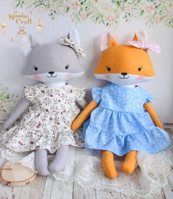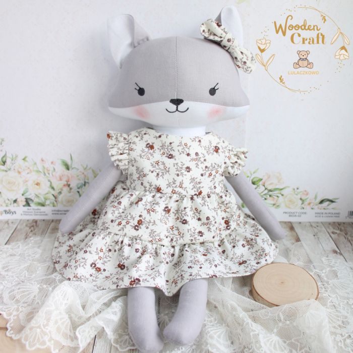 Przeurocza przytulanka, lisek a właściwie lisiczka w odcieniach szarości i bieli, uszyta ręcznie z najwyższą starannością, ubrana w beżowo-bordową sukieneczkę z falbankami, w drobne kwiatuszki. Wykonana ze 100% bawełny, wypełniona antyalergiczną kulką silikonową. Oczka, nosek i uśmiech malowane wodoodpornym markerem, uszko ozdobione kokardką. Sukieneczkę można swobodnie zdejmować, zapinana jest na rzep. Górne i dolne łapki układają się luźno, lisiczka siedzi z podparciem.