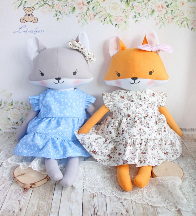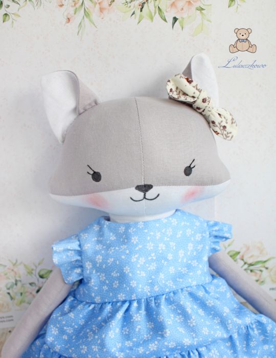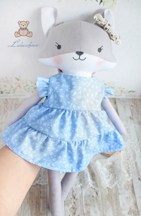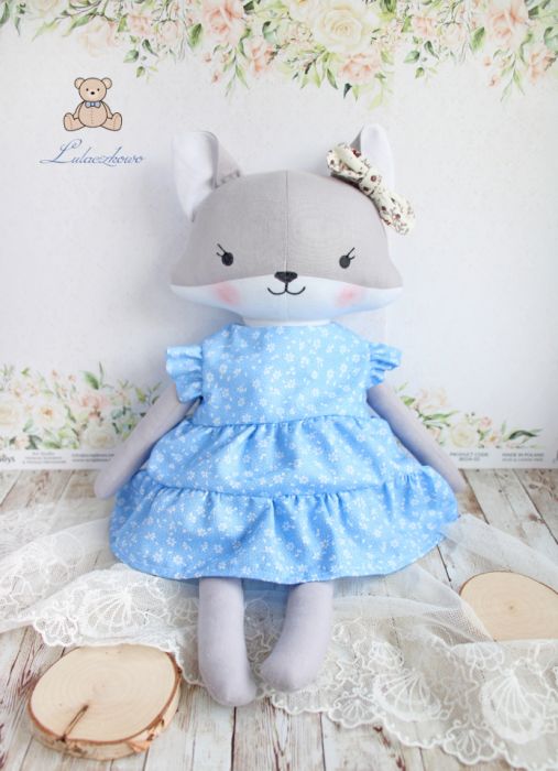Przeurocza przytulanka, lisek a właściwie lisiczka w odcieniach szarości i bieli, uszyta ręcznie z najwyższą starannością, ubrana w błękitną sukieneczkę z falbankami, w drobne kwiatuszki. Wykonana ze 100% bawełny, wypełniona antyalergiczną kulką silikonową. Oczka, nosek i uśmiech malowane wodoodpornym markerem, uszko ozdobione kokardką. Sukieneczkę można swobodnie zdejmować, zapinana jest na rzep. Górne i dolne łapki układają się luźno, lisiczka siedzi z podparciem.