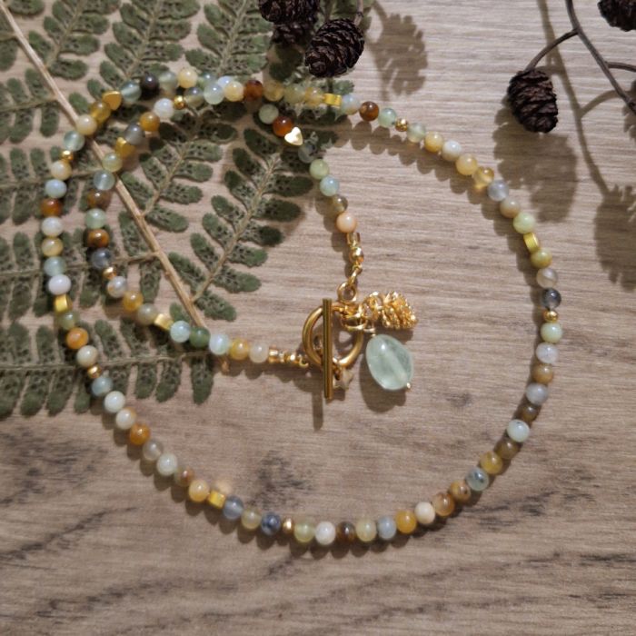 Naszyjnik wykonany z przepięknych, subtelnych a jednak kolorowych kamieni: agatów o średnicy 4 mm, hematytów w kształcie złotych serduszek, dużego frenitu oraz pozłacanego* srebra 925 (kulaczki), stali szlachetnej (zapięcie, szpilki, zakończenia i kółeczka), mosiądzu (gwiazdka)i metalu (szyszka).