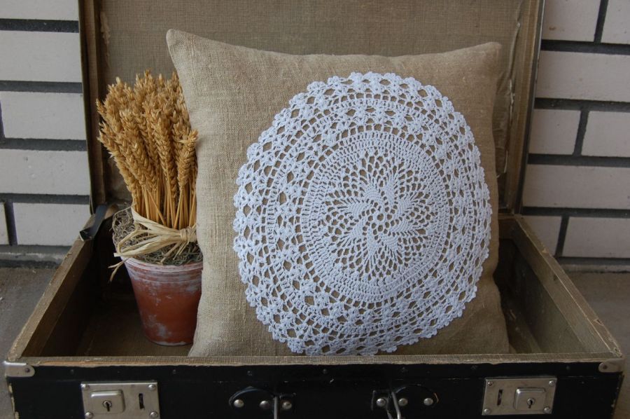 Lniana poszewka "Prowansalski szyk" - baza poduszki to naturalny len, ozdobiona na przodzie koronkową serwetką wykonaną na szydełku. Tył poduszki gładki, zapinana na dole na zamek błyskawiczny. Cała poduszka utrzymana w prowansalskim stylu.