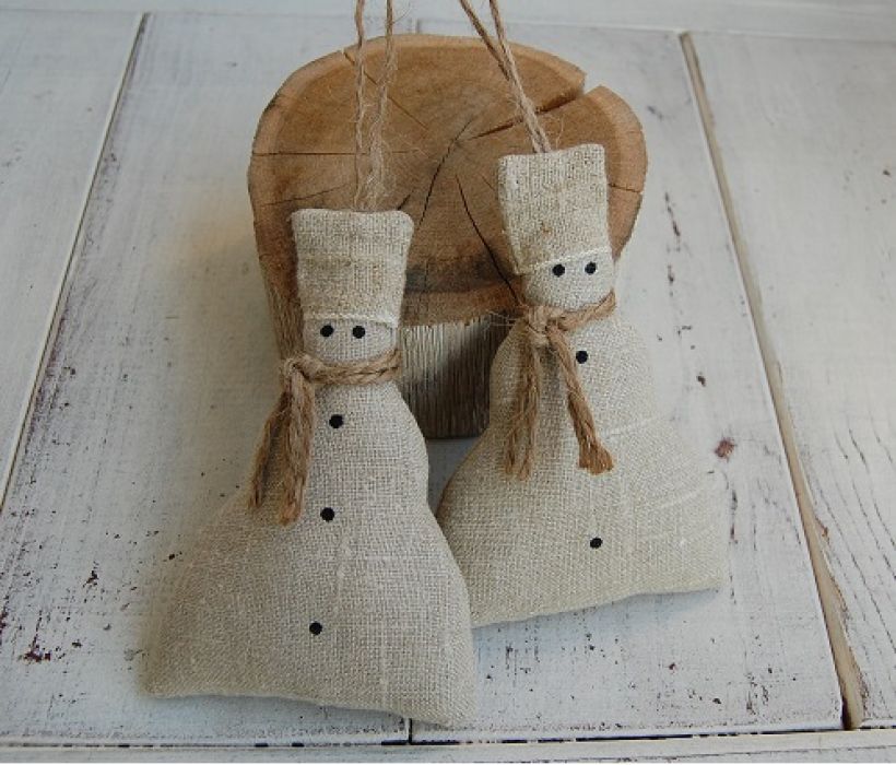Lniane bałwanki w czapach - mogą spełniać rolę choinkowej ozdoby lub świątecznej zawieszki niekoniecznie umieszczonej na choince. Wykonane z naturalnego lnu, otulone "szalami" ze sznura jutowego. Na głowach czapy z grubego lnu. Oczy i guziczki ręcznie malowane farbami do tkanin. W środku wypełnione kulką silikonową.