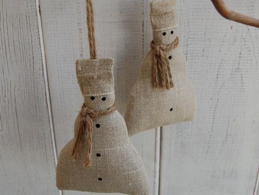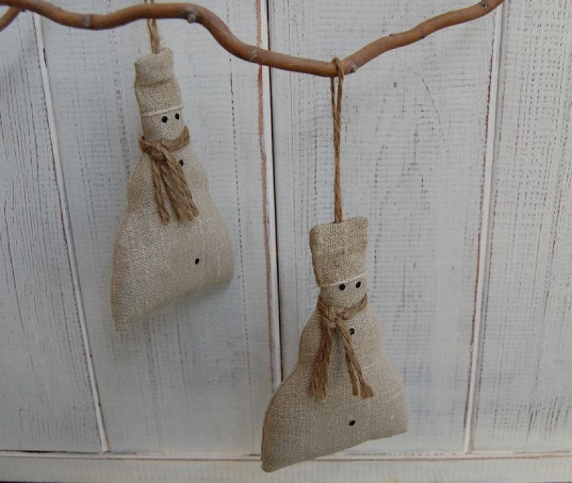 Lniane bałwanki w czapach - mogą spełniać rolę choinkowej ozdoby lub świątecznej zawieszki niekoniecznie umieszczonej na choince. Wykonane z naturalnego lnu, otulone "szalami" ze sznura jutowego. Na głowach czapy z grubego lnu. Oczy i guziczki ręcznie malowane farbami do tkanin. W środku wypełnione kulką silikonową.