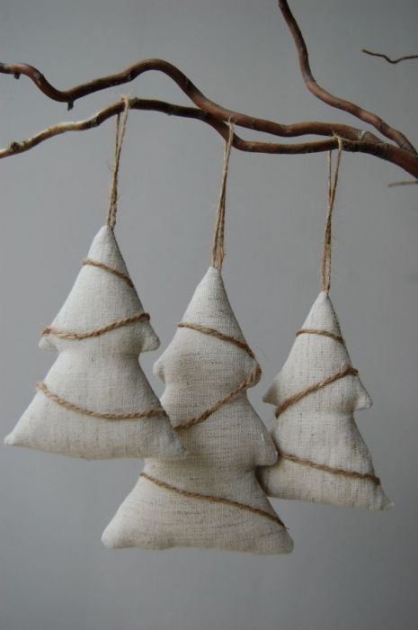 Lniane choinki - mogą spełniać rolę choinkowej ozdoby lub świątecznej zawieszki niekoniecznie umieszczonej na choince. Dodatkową ozdobą choineczek są "łańcuchy" ze sznura jutowego. Całość utrzymana w naturalnej, rustykalnej stylistyce.