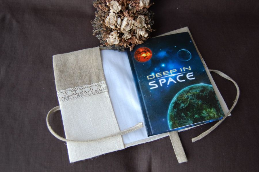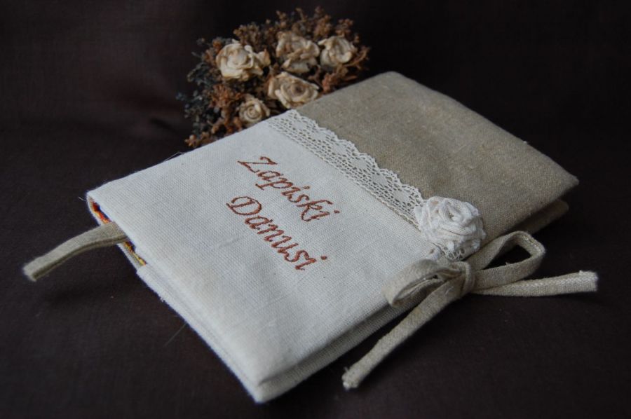 Lniane zapiski - notes w skład którego wchodzi brulion 96cio kartkowy w kratkę (format A5) w twardej oprawie oraz lniana okładka.Okładka uszyta z połączenia lnu w kolorze ecri i szarego, ozdobiona bawełnianą koronką, ręcznie zrobioną białą różą oraz haftowanym napisem. Notes "zamykany" na wiązanie z tkaniny, dodatkowy atut to zakładka. W środek dana ocieplina, przez co okładka jest miękka i puchata, wykończona od lewej strony podszewką.