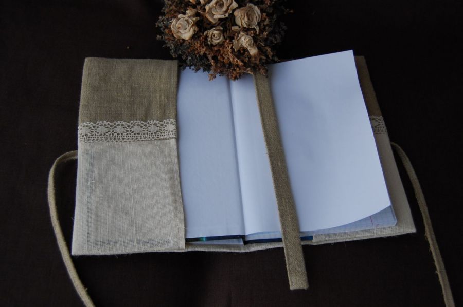 Lniane zapiski - notes w skład którego wchodzi brulion 96cio kartkowy w kratkę (format A5) w twardej oprawie oraz lniana okładka.Okładka uszyta z połączenia lnu w kolorze ecri i szarego, ozdobiona bawełnianą koronką, ręcznie zrobioną białą różą oraz haftowanym napisem. Notes "zamykany" na wiązanie z tkaniny, dodatkowy atut to zakładka. W środek dana ocieplina, przez co okładka jest miękka i puchata, wykończona od lewej strony podszewką.