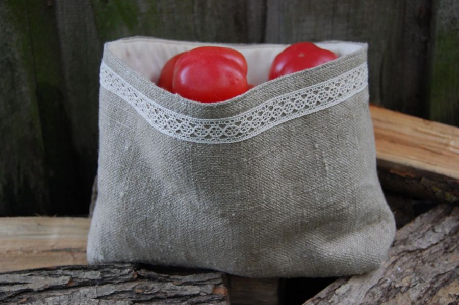 Woreczko - koszyczek wykonany z naturalnego lnu, ozdobiony klockową koronką. W środku bawełniana podszewka. Usztywniony warstwą ociepliny. Koszyczek utrzymany w rustykalnej stylistyce.