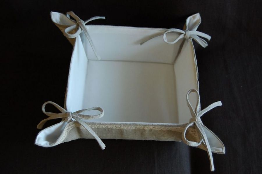 Tekstylny koszyk - uszyty z 100% lnu tkanego na krośnie, w środku bawełniana podszewka. Wierzchnia część (lniana) ozdobiona bawełnianą koronką w kolorze ecri. Ścianki i spód koszyka wzmocnione zostały plastikowym tworzywem, dzięki czemu można go prać ręcznie. Wiązania wykonane z tego samego materiału - są przez to sztywne, i w odróżnieniu od wiązań z satynowych, bawełnianych tasiemek ładniej się prezentują.