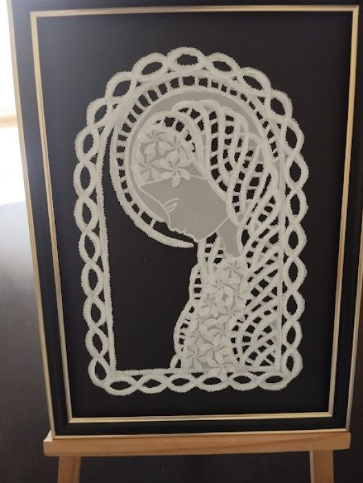 Madonna wykonana techniką pergaminową , oryginalna technika i piękny obraz Wielkość 24x32 cm Za szybą możliwość postawienia/ma podpórkę z tyłu lub zawieszenia jest zawieszka