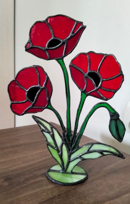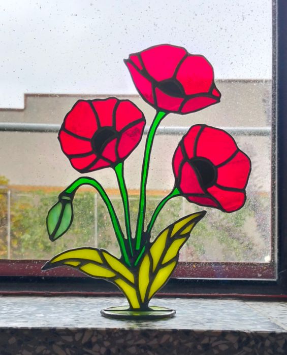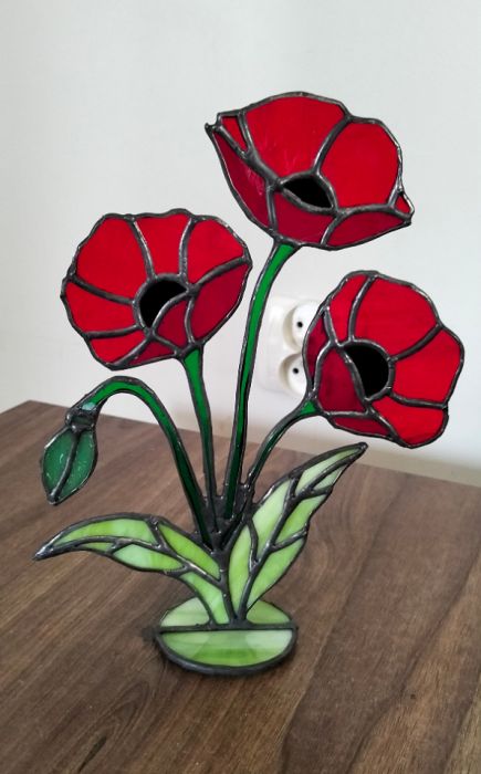 Ta wyjątkowa dekoracja witrażowa przedstawiająca trzy czerwone maki to połączenie tradycyjnego rzemiosła i artystycznej pasji. Każdy element został starannie wycięty i oprawiony w czarne kontury, które podkreślają intensywne barwy szkła. Czerwień kwiatów pięknie kontrastuje z zielenią liści i łodyg, tworząc harmonijną, pełną życia kompozycję.
