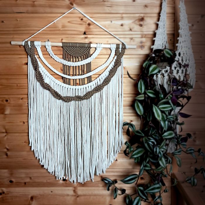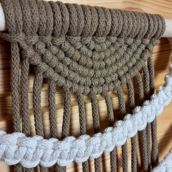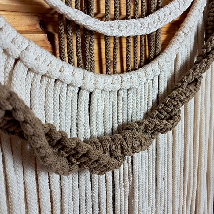 Makrama została wykonana techniką tradycyjnego plecenia, która od lat zachwyca swoją prostotą, a jednocześnie ogromnymi możliwościami tworzenia złożonych, efektownych kompozycji. Każdy splot, każdy węzeł i każda warstwa zostały wykonane z dbałością o najmniejszy detal, co sprawia, że dekoracja prezentuje się niezwykle elegancko i profesjonalnie. Połączenie kremowego sznurka z brązowym akcentem nadaje jej ciepły, naturalny charakter, który idealnie wpisuje się w klimat wnętrz inspirowanych naturą, drewnem i spokojem.