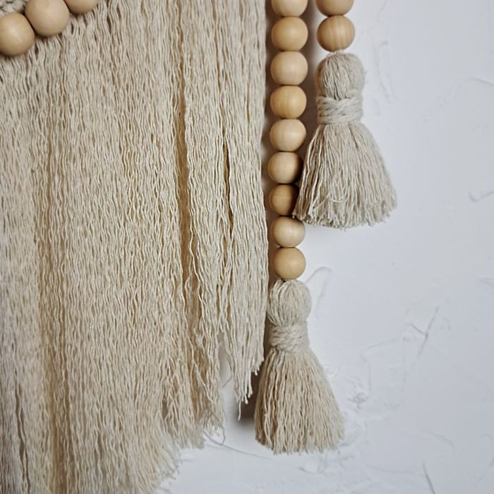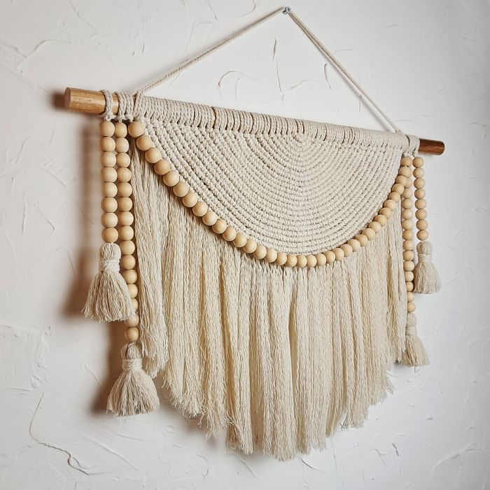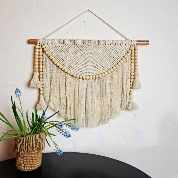 Makrama została wykonana tradycyjną techniką plecenia, która pozwala tworzyć niezwykle efektowne wzory z prostych materiałów. Makrama „Aura Spokoju” to wyjątkowa dekoracja ścienna, która wprowadza do wnętrza harmonię, naturalność i subtelny, rękodzielniczy urok. Wykonana z miękkiego, kremowego sznurka bawełnianego, zachwyca starannie plecionym półokrągłym wzorem, ozdobionym drewnianymi koralikami i delikatnie opadającymi frędzlami.