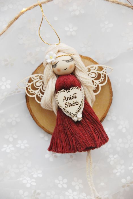 Delikatne włosy z naturalnych sznurków, subtelne drewniane skrzydła o misternym wzorze i lekka, kwiecista sukienka w burgundowym odcieniu nadają mu niezwykłego uroku. W sercu aniołka znajduje się drewniane serduszko z napisem „Anioł Stróż” – symbol opieki, miłości i dobrych myśli.