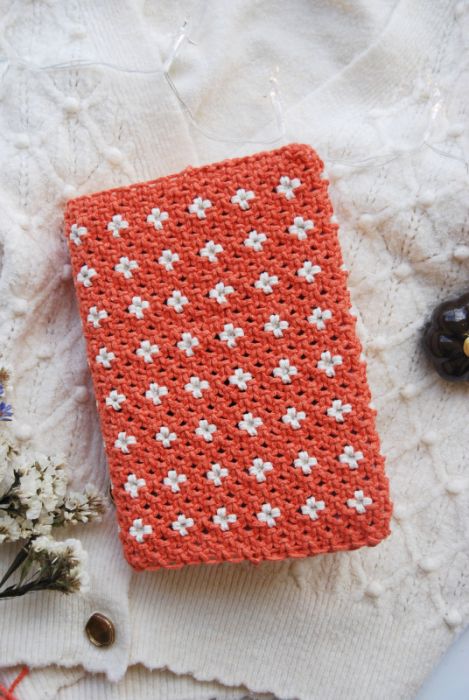 Makramowy otulacz na książkę w pięknym kolorze - dyniowym.