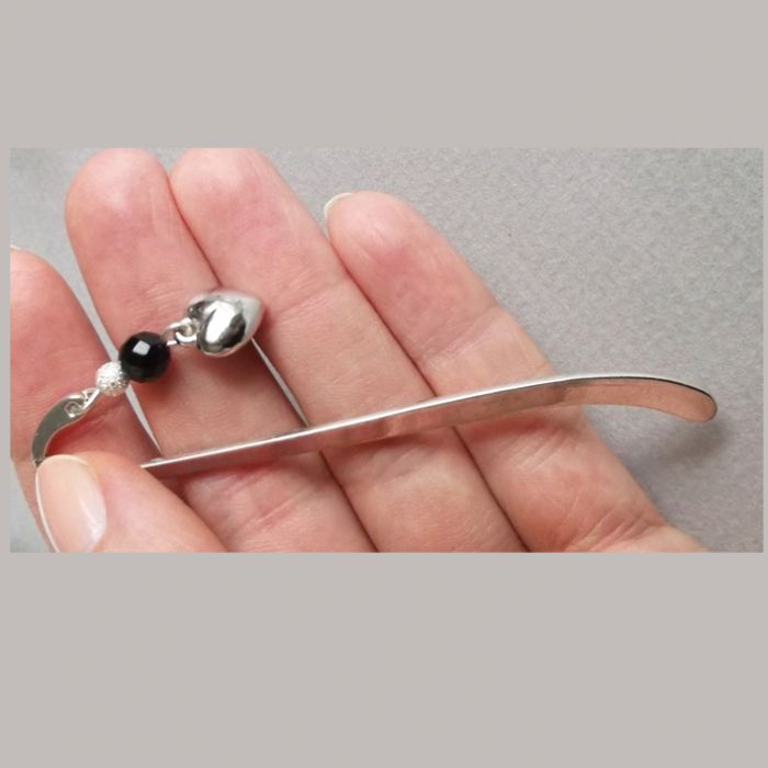 Mała, metalowa zakładka do książek z sercem dwustronnym wypukłym i czarnym kamykiem. Ozdobnie pakuję -na prezent.