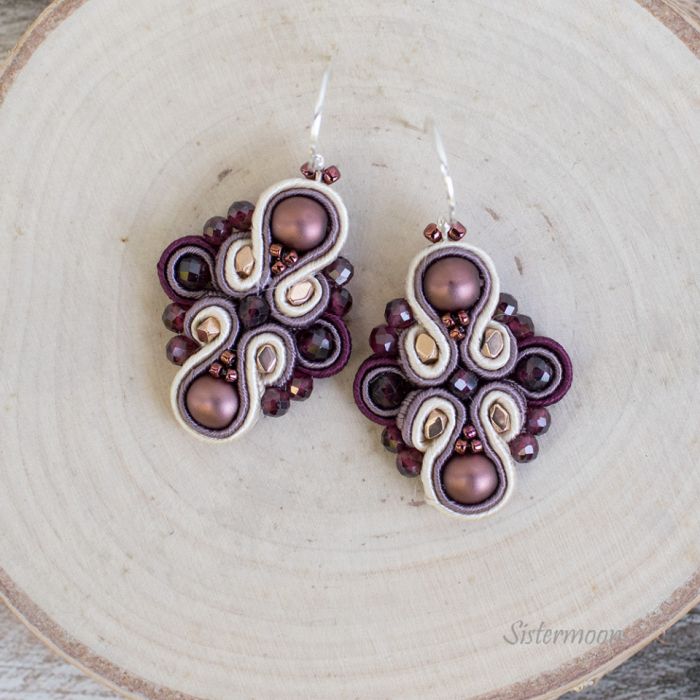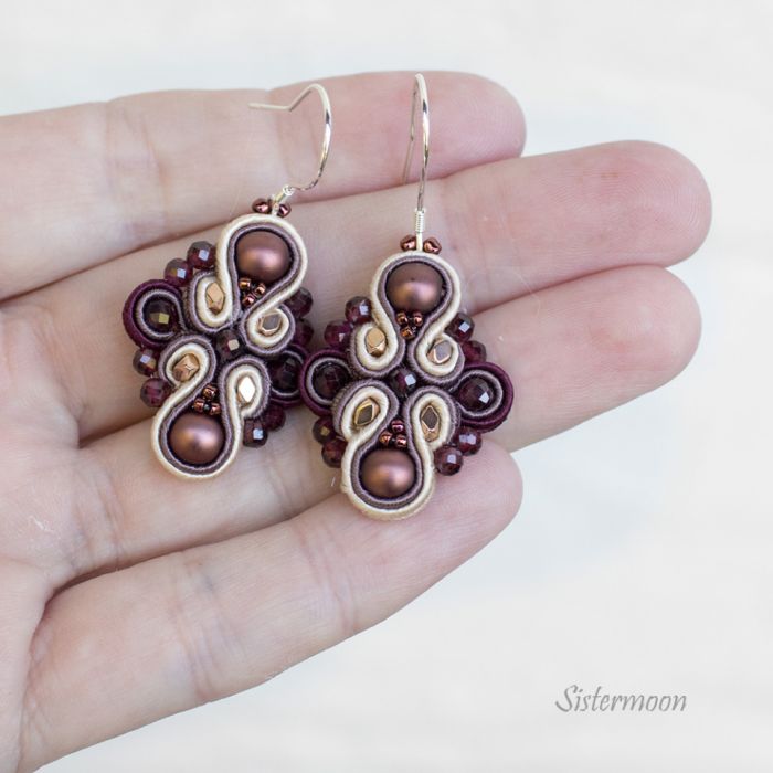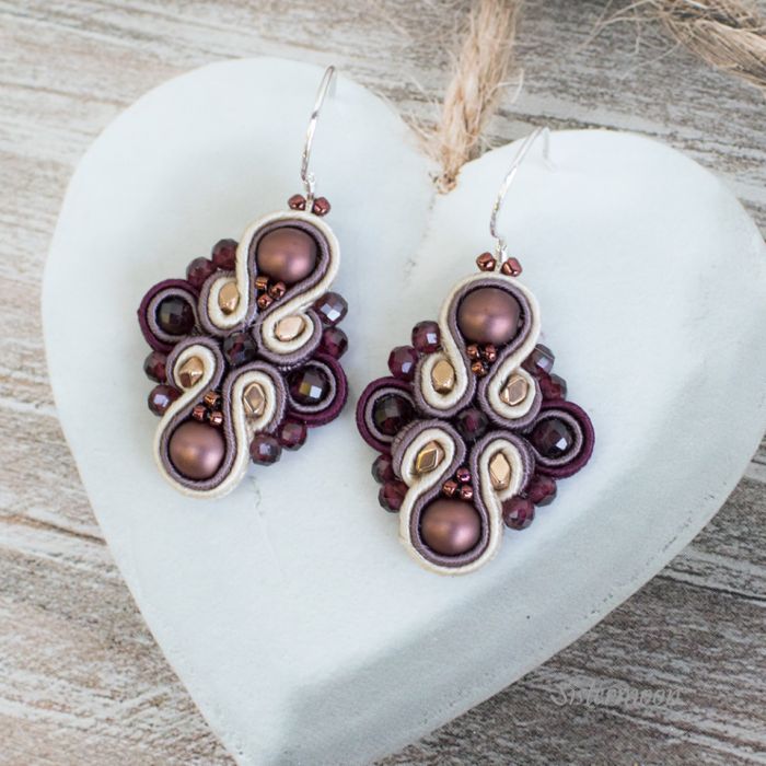 Małe brązowe kolczyki sutasz z dodatkiem błyszczących fasetowanych drobnych granatów i złotych hematytów. Japońskie koraliki Toho z nieścieralną powłoką, kaszmirowe szklane perełki, sutasz włoski i czeski, spód wykończony naturalną skórką. Wysokość z biglem 5 cm, bez 3,5 cm, szerokość 2,5 cm.
