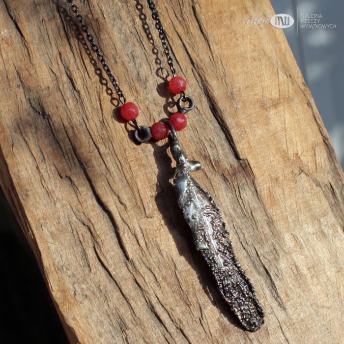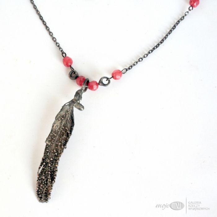 Ptasie pióro (prawdziwe) pokryte warstewką miedzi w długotrwałej technice elektroformowania. Miedź pokryta jest cyną, patynowana i przetarta dla wydobycia faktury, która powstałam w chemicznym procesie. Ozdobą są fasetowane kulki marmuru w kolorze jasno-buraczkowym. Sposób wykonania sprawia, że pióro nie jest idealnie gładkie, ma chropowatą powierzchnię.