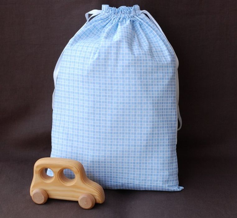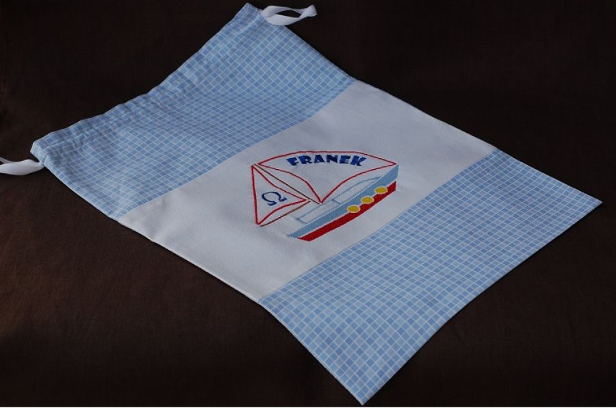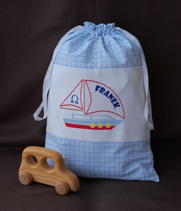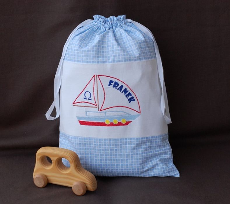 Worek na zabawki - worek do przechowywania zabawek; połączenie bawełny w biało-niebieską kratkę z białą bawełną, na której została wyhaftowana żaglówka oraz na jednym z żagli imię dziecka. Na górze tunel, a w środku bawełniana tasiemka ściągająca woreczek.