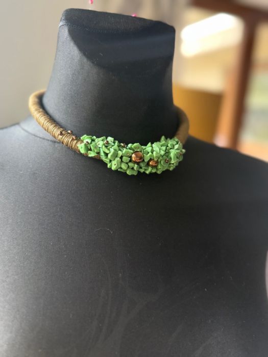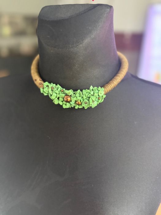 Unikatowy naszyjnik wykonany z liny w oplocie z lnu w kolorze beżowo-kawowym, wykończony naturalnymi kamieniami.