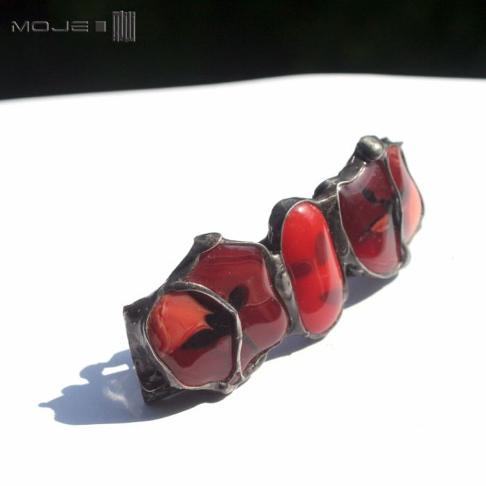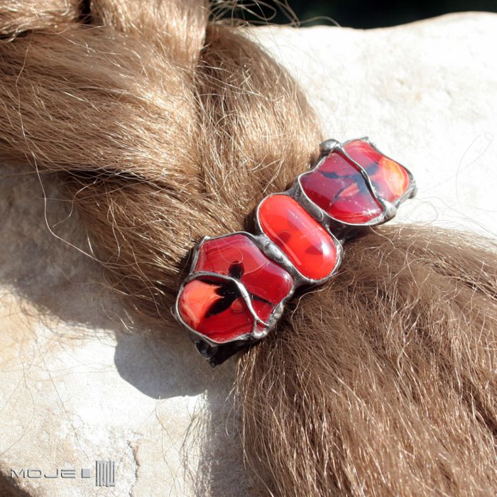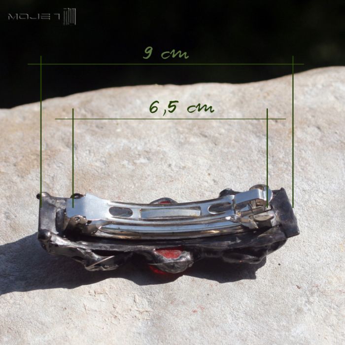 Ozdobna klamra do włosów z miedzianej blachy i szklanych kaboszonów w odcieniach czerwieni, bieli i zieleni. Miedź jest cynowana, patynowana i przecierana. Klamra to standardowy metalowy mechanizm.