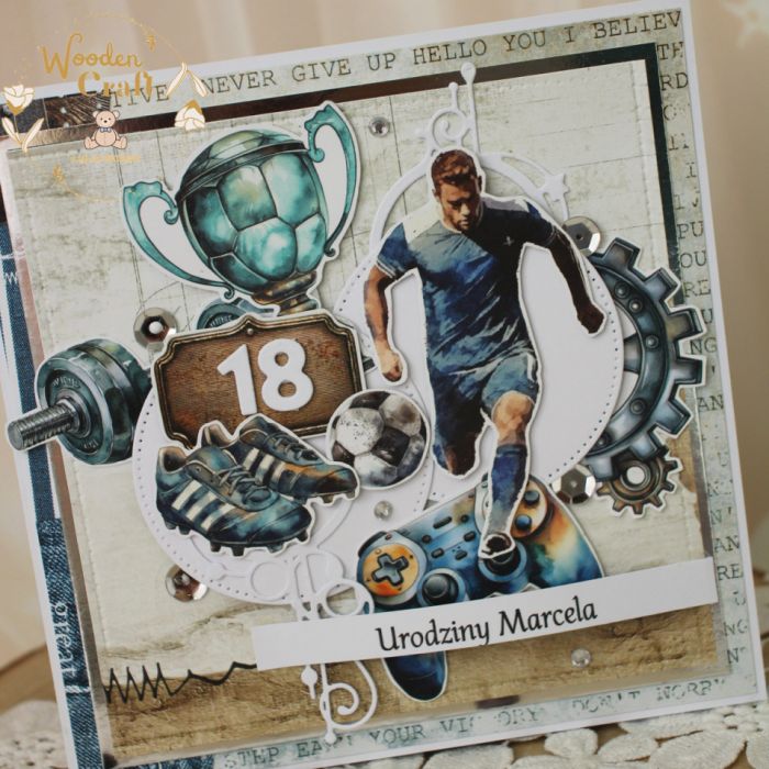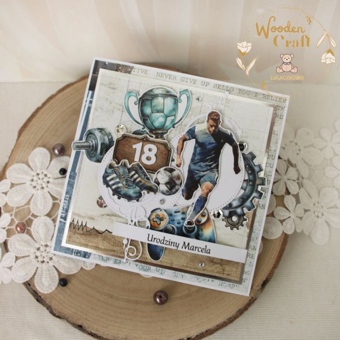 Nietuzinkowa, męska kartka urodzinowa, idealna na 18 urodziny fana piłki nożnej. Utrzymana w odcieniach beżu z dodatkiem błyszczących srebrnych akcentów, zamknięta w białym pudełeczku z okienkiem. Wykonana ręcznie z mixu męskich kolekcji papierów, ozdobiona licznymi grafikami o tematyce piłkarskiej, srebrnymi cekinami, a także napisem "Twój Dzień", imieniem solenizanta oraz cyferką 18.