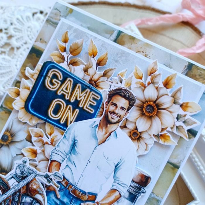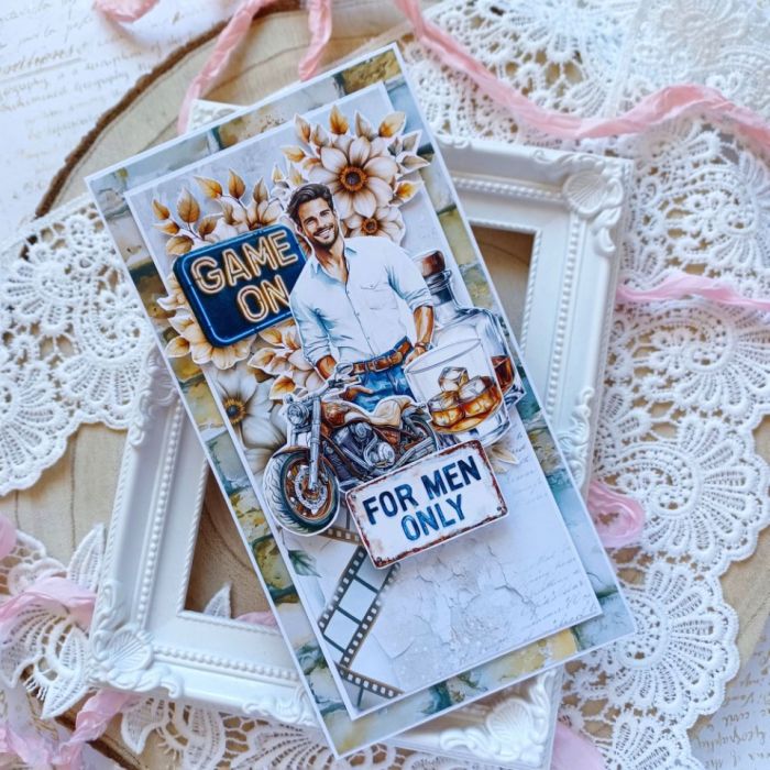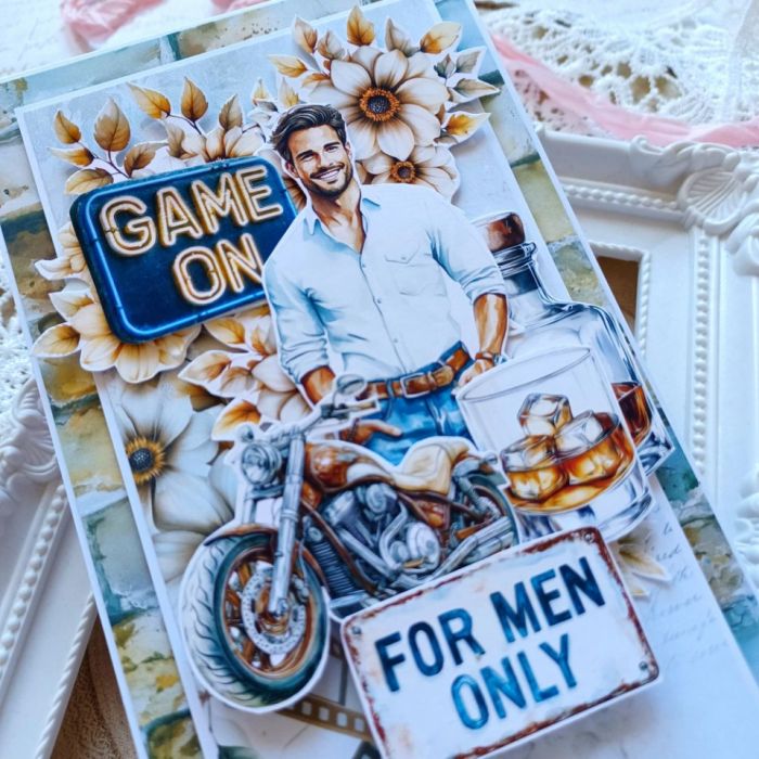 Wykonana z użyciem techniki scrapbookingu, kartka wyróżnia się efektem 3D i bogatą, warstwową kompozycją. Centralnym punktem jest stylowa grafika przedstawiająca uśmiechniętego mężczyznę, motocykl, szklankę whisky z lodem oraz neony "Game On" i "For Men Only".