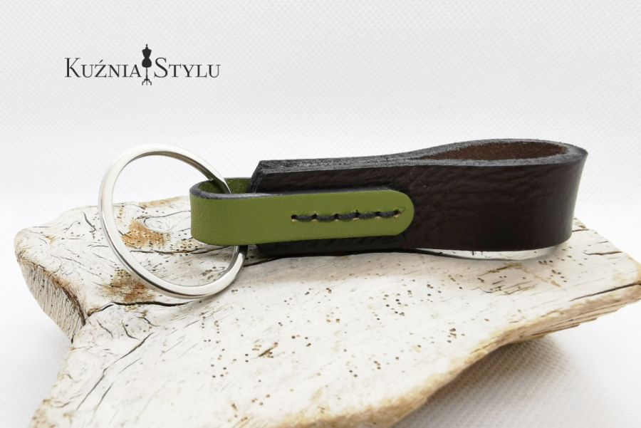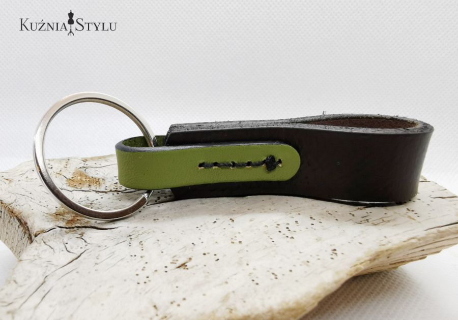 Brelok do kluczy męski, wykonany ze skóry naturalnej w kolorze brązowy - czekoladowym z doszytym zielonym rzemykiem. Wykonany w 100 % handmade bez użycia kleju, rzemyki są ze sobą zszyte.