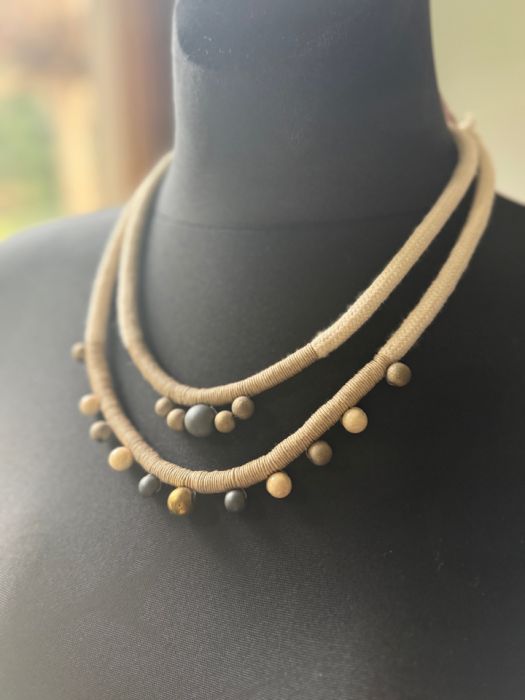 Unikatowy naszyjnik wykonany z lin bawełnianych w kolorze kremowym przy udziale kamieni naturalnych - hematyt.