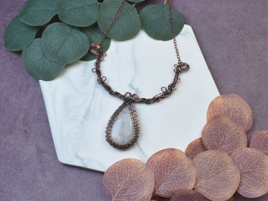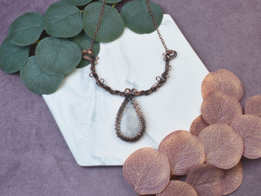 Naszyjnik wykonany metodą wire wrapping z miedzią, ozdobiony uroczym kamieniem księżycowym. Delikatne zawinięcia drutu podkreślają naturalną magię kamienia, tworząc subtelny, lecz wyrazisty design. Kamień księżycowy emanuje delikatnym blaskiem, który zmienia się w zależności od kąta światła, przypominając mgliste księżycowe światło. Miedź, z której wykonany jest naszyjnik, nadaje mu rustykalny urok, idealnie współgrający z subtelną aurą kamienia księżycowego.
