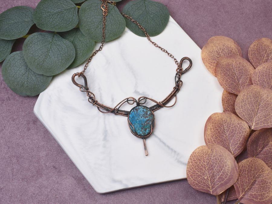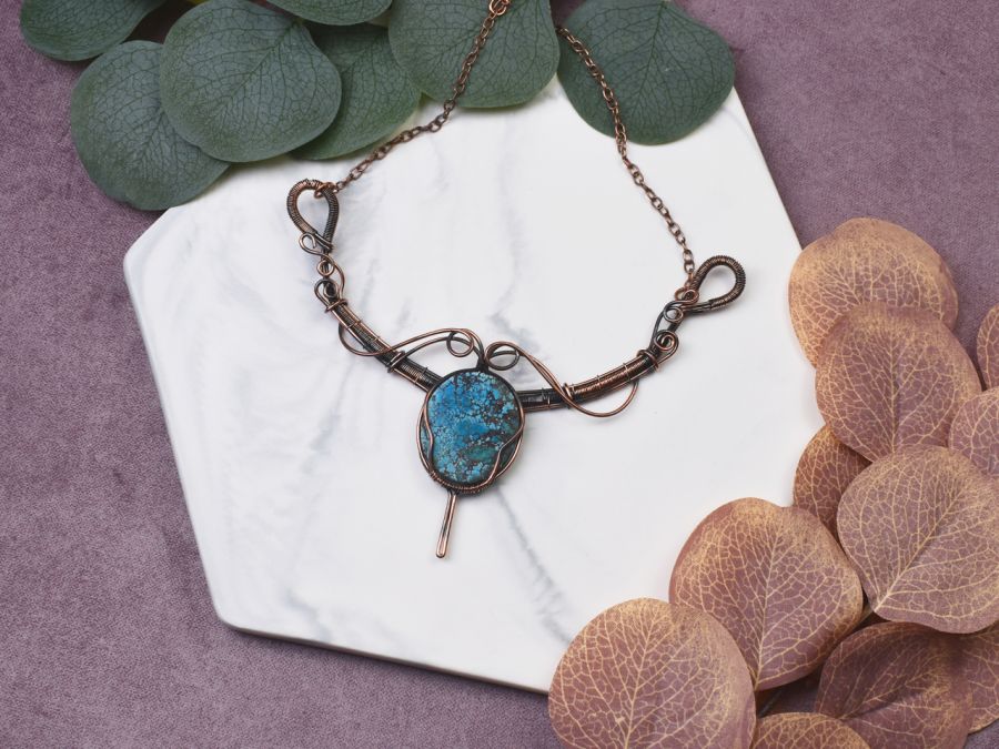 Ten miedziany naszyjnik z turkusem wyróżnia się unikalną techniką wire wrapping. Mistrzowsko owinięte druty podkreślają piękno surowego turkusu, nadając całości industrialno-etnicznego charakteru. Naszyjnik emanuje prostotą i elegancją, a turkus, uważany za kamień ochronny, dodaje mu subtelnej mocy. To wyjątkowe połączenie ręcznej pracy i naturalnych elementów sprawia, że naszyjnik jest nie tylko pięknym dodatkiem do stylizacji, ale także nosicielem pozytywnej energii.