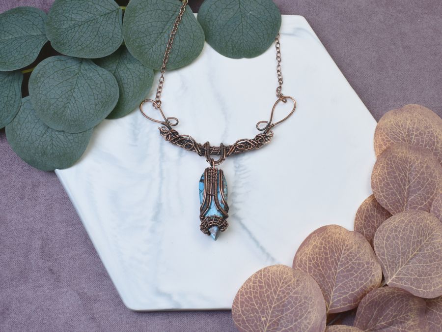 Ten miedziany naszyjnik z turkusem wyróżnia się unikalną techniką wire wrapping. Mistrzowsko owinięte druty podkreślają piękno surowego turkusu, nadając całości industrialno-etnicznego charakteru. Naszyjnik emanuje prostotą i elegancją, a turkus, uważany za kamień ochronny, dodaje mu subtelnej mocy. To wyjątkowe połączenie ręcznej pracy i naturalnych elementów sprawia, że naszyjnik jest nie tylko pięknym dodatkiem do stylizacji, ale także nosicielem pozytywnej energii.