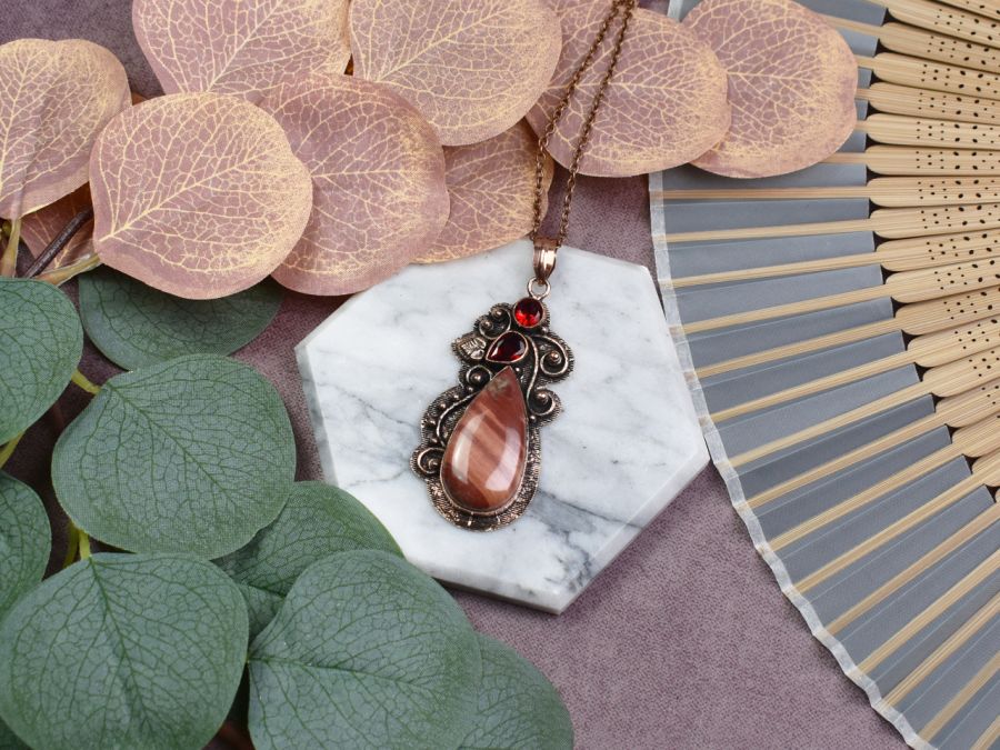 Zadaj pytanie dotyczące produktu: Miedziany ozdobny wisiorek z czerwonym jaspisem i granatem #545