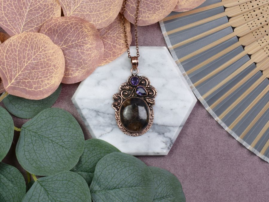 Zadaj pytanie dotyczące produktu: Miedziany ozdobny wisiorek z jaspisem i ametystem #555