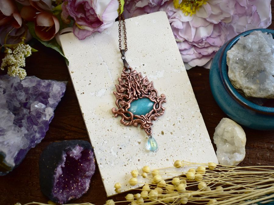 Wisiorek w stylu wiktoriańskim, wykonany z wykorzystaniem techniki elektroformowania, ozdobiony amazonitem i wykończony patyną, która nadaje mu głębi i szlachetnego, postarzanego charakteru. Delikatne detale i ornamentyka inspirowana XIX-wieczną estetyką przywodzą na myśl dawne amulety i biżuterię z epoki, w której symbolika i rzemiosło miały szczególne znaczenie. Amazonit, o swojej chłodnej, zielono-niebieskiej barwie, wprowadza do kompozycji nutę spokoju i harmonii, pięknie kontrastując z ciemniejszą, patynowaną powierzchnią metalu. Całość tworzy elegancki, nastrojowy wisiorek o wyraźnie historycznym charakterze, idealny dla osób ceniących biżuterię artystyczną, styl vintage oraz unikatowe formy inspirowane dawnymi epokami.