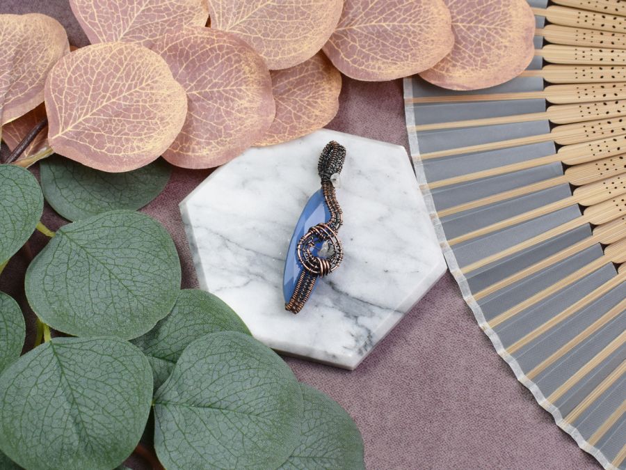 Miedziany wisiorek, wykonany delikatną techniką wire wrapping, to wyjątkowy dodatek ozdobiony niebieskim chalcedonem. Kamień ten, znany również jako niebieski kalcydon, emanuje spokojem i harmonią. Jego właściwości sprzyjają głębokiemu zrozumieniu, przynosząc równowagę emocjonalną i wewnętrzną pewność. Ten piękny wisiorek nie tylko zachwyca swą subtelnością i elegancją, ale również niesie ze sobą energię, która wspiera spokój umysłu i klarowność myśli. To nie tylko biżuteria, lecz także talizman, który może towarzyszyć noszącemu na co dzień, przypominając o sile spokoju i równowagi.