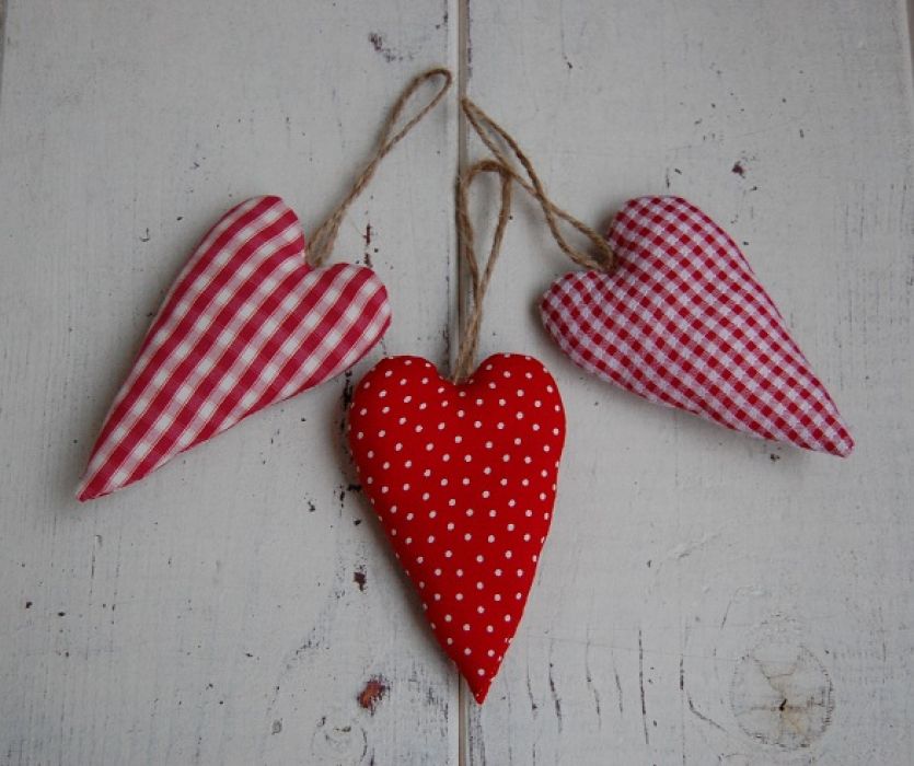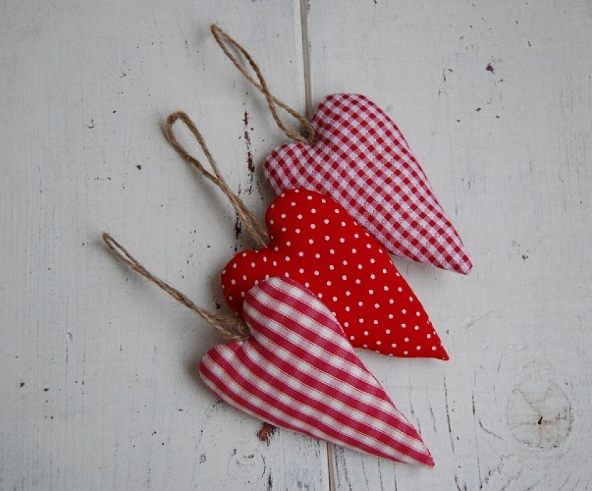 Komplet świątecznych serduszek - mogą spełniać rolę choinkowych ozdób lub świątecznych zawieszek niekoniecznie umieszczonych na choince. Utrzymane w bożonarodzeniowej kolorystyce. Pętelka do zawieszenia wykonana jest ze sznura jutowego. W środku wypełnienie poduszkowe.