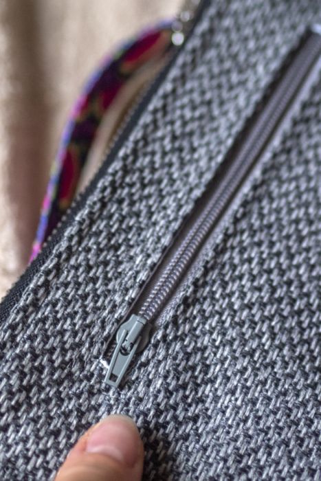 Małe zaszewki na dnie. Z tyłu oraz w środku torebki kieszonki zapinane na suwak. Środek wykończony bawełnianą podszewką.