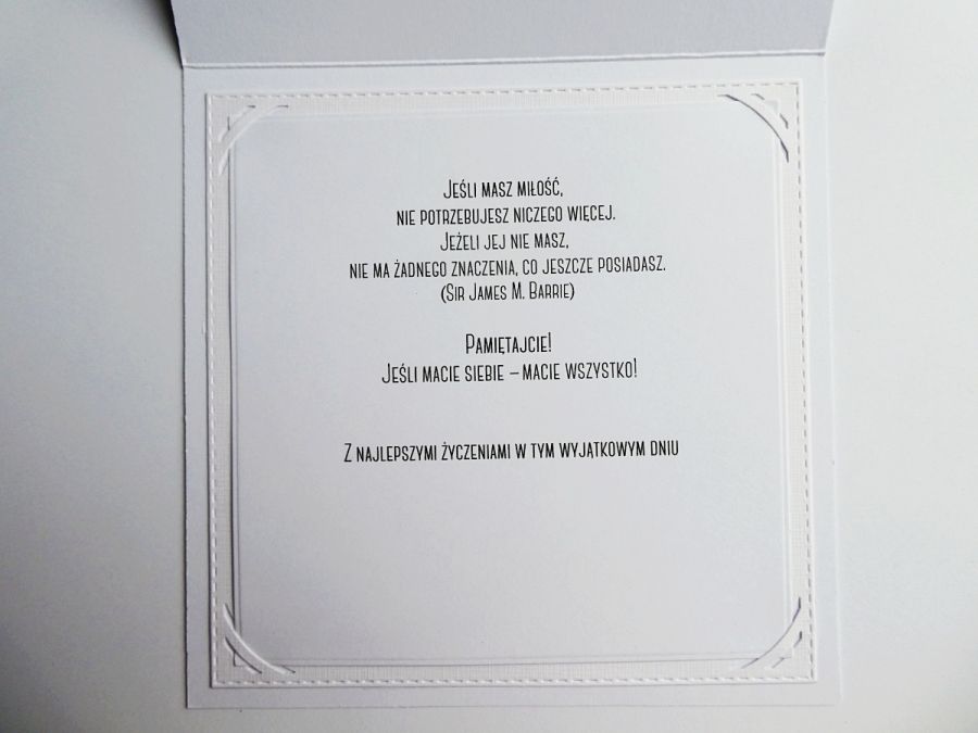 Kartka ma wklejony w środku biały karnecik, w którym umieszczona została wkładka z życzeniami.