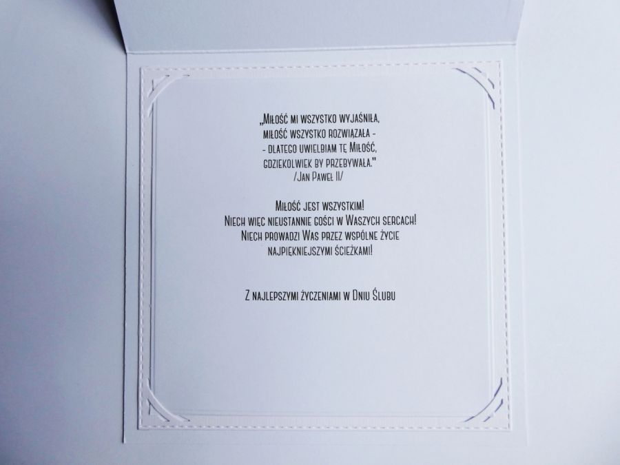 Kartka ma wklejony w środku biały karnecik, w którym umieszczona została wkładka z życzeniami.