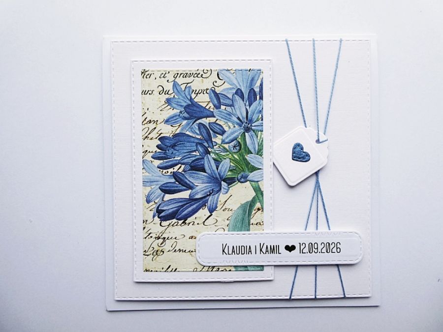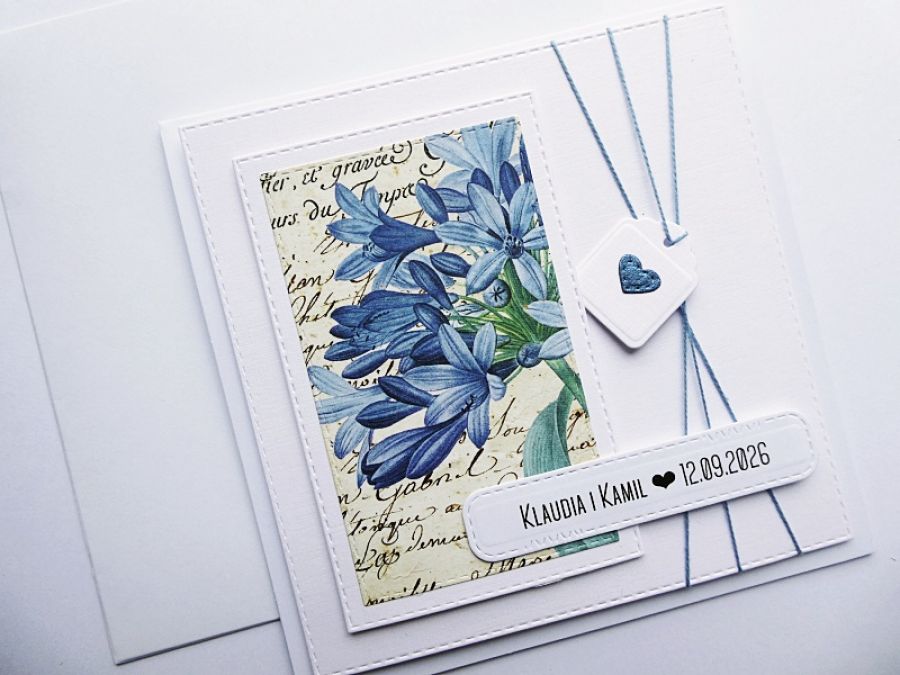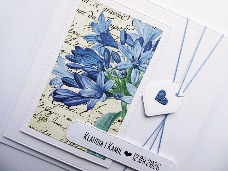Kartka jest ozdobiona elementami, które dodają jej odrobinę retro klimatu - piękną grafiką z motywem niebieskich kwiatów i kremowym tłem z imitacją odręcznego pisma.