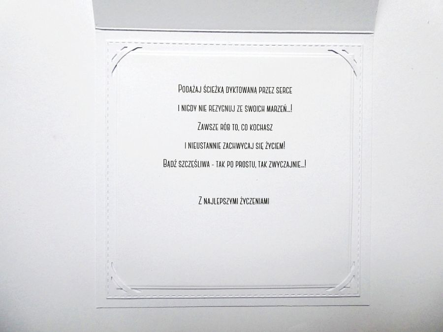 Kartka w środku ma wklejony biały karnecik, w którym umieszczona została wkładka z życzeniami.