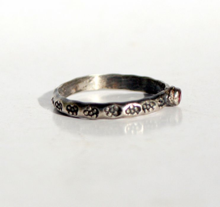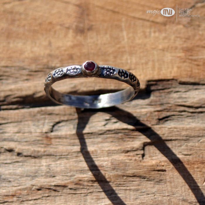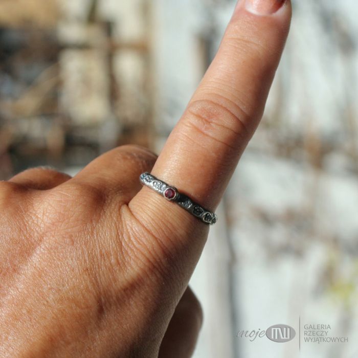 Delikatna obrączka ze srebra oraz malutkiego fasetowanego granatu. Srebro jest ozdobione stylizowanym kwiatowym deseniem, oksydowane i przetarte dla wydobycia faktury, częściowo polerowane. Pierścionek dla lubiących raczej delikatniejszą biżuterię.