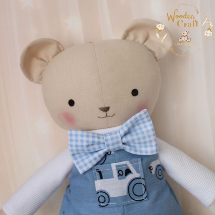 Przeurocza przytulanka, miś w kolorze beżowym, uszyty ręcznie z najwyższą starannością, ubrany w mięciutki biały sweterek i spodenki ogrodniczki w kolorze niebieskim z motywem autek oraz uroczą błękitną muszkę. Wykonany ze 100% bawełny, wypełniony antyalergiczną kulką silikonową. Oczka malowane wodoodpornym markerem, nosek i buźka wyszyte muliną. Górne i dolne łapki układają się luźno, misiulek siedzi z podparciem. Sweterek i spodenki można swobodnie zdejmować, w pasie wszyta jest gumeczka, muszka również jest na gumeczce.